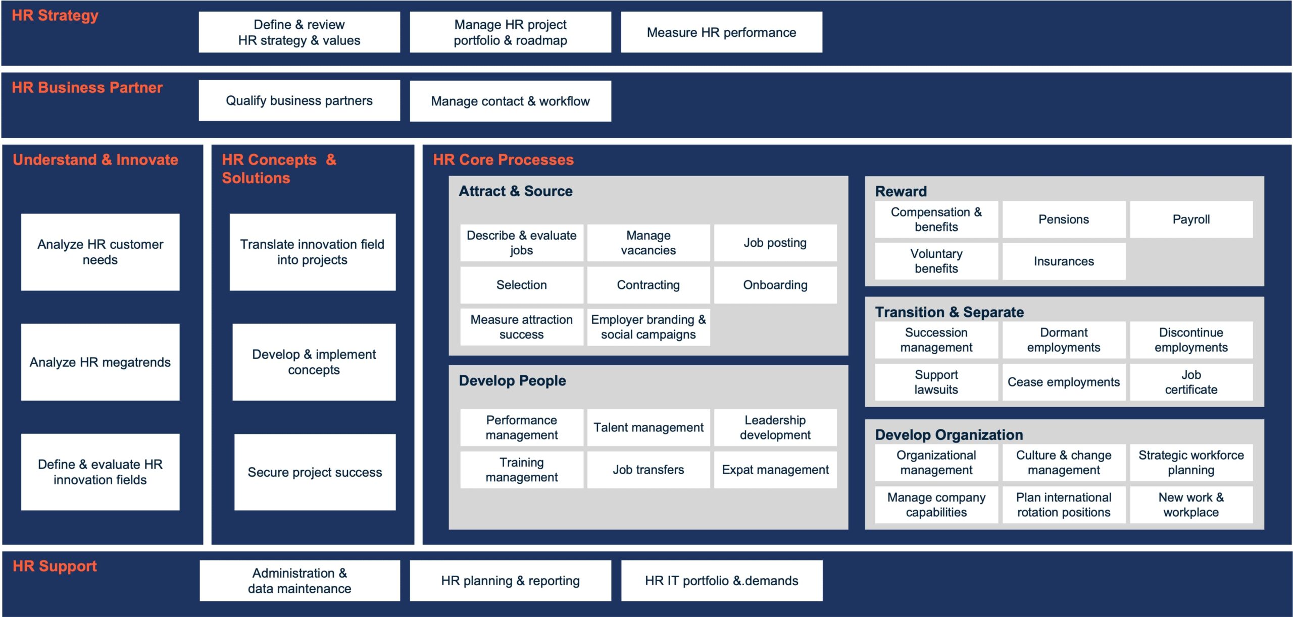 Unser HR Prozessreferenzmodell bildet den Rahmen für die Festlegung von Prioritäten und liefert zugleich Best Practices für detaillierte Prozessbeschreibungen.