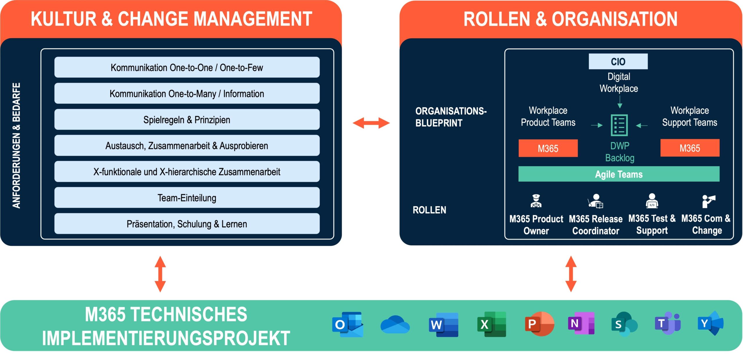 Die Implementierung von Microsoft 365 ist nicht nur ein IT-Projekt, bei dem die Office Suite ausgetauscht wird und die Migration der Daten in die Cloud erfolgt. Es setzt zusätzlich einen Kulturwandel bei Ihren Mitarbeitern hinsichtlich Kommunikation, Information und Kollaboration voraus.